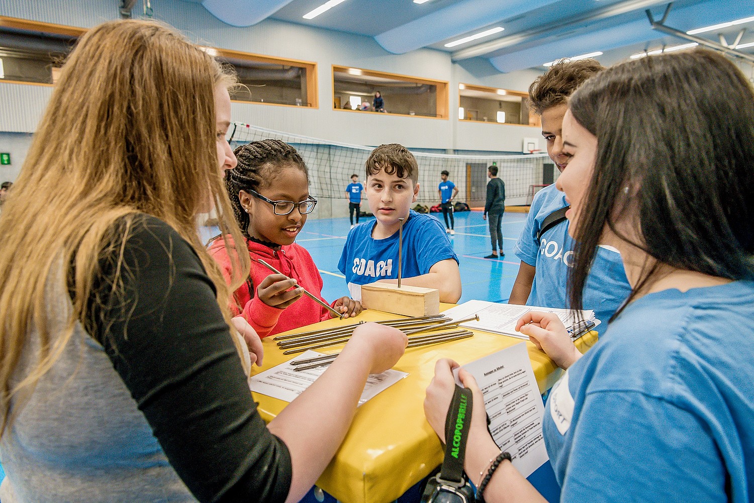 Die Mitarbeit und Förderung der Jugendlichen ist ein zentrales Element aller Programme von IdéeSport. Dabei möchte die Stiftung explizit auch Jugendlichen mit tiefen Bildungschancen neue Möglichkeiten bieten. Mit dem «CoachProgramm» werden Jugendliche zwischen 13 und 25 Jahren an die Arbeitswelt herangeführt. Sie lernen, wichtige Sozial-, Sach- und Selbstkompetenzen sowie die Aktivitäten in den Sporthallen zu organisieren und einen reibungslosen Ablauf zu gewährleisten. Vor Ort übernehmen die Coaches Vorbildfunktionen, indem sie andere Kinder und Jugendliche motivieren, sich einzubringen. Bei jeder Veranstaltung sind jeweils fünf Junior-Coaches in der Halle. Anna-Lena geht in Oberdiessbach in die siebte Klasse und ist an diesem Abend im blauen T-Shirt im Einsatz. Es sei cool, mit Gleichaltrigen und anderen Sport zu machen. Wenn den anderen Ideen ausgehen, könne sie Vorschläge bringen. «Ich möchte gerne Jungscharleiterin werden, was aber erst nach Abschluss der neunten Klasse möglich ist. Als Coach kann ich hierfür schon jetzt wertvolle Erfahrungen sammeln», meint sie. Als Coach erhält sie nicht nur 20 Franken pro Einsatz, sondern auch ein Kursdiplom sowie ein Arbeitszeugnis von IdéeSport.