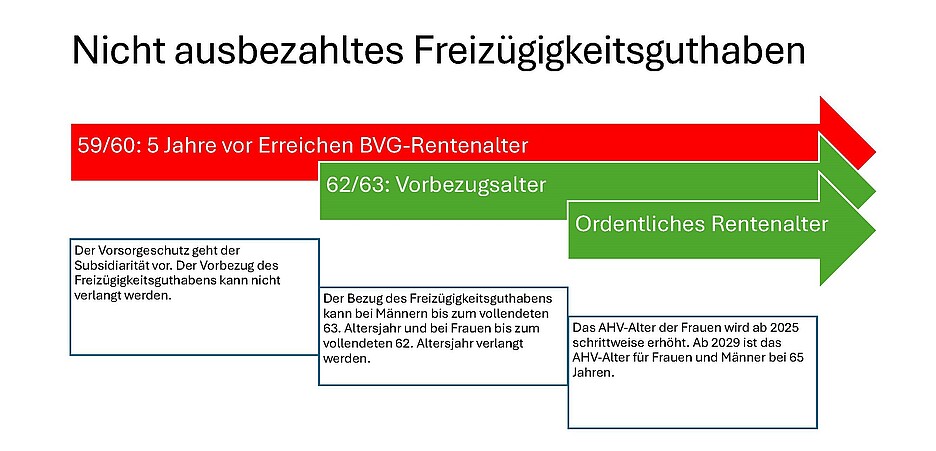 Als Freizügigkeitsleistungen werden diejenigen Altersguthaben bezeichnet, die sich aus dem Vermögen der zweiten Säule (Berufsvorsorgegesetz, BVG) und aus der Säule 3a (private Spareinlagen) zusammensetzen. Verlässt ein Arbeitnehmer sein bisheriges Arbeitsverhältnis und geht nicht direkt ein neues ein, wird das bisher angesparte Pensionskassengeld auf ein Freizügigkeitskonto überwiesen. Die Freizügigkeitsordnung sieht vor, dass Guthaben aus Freizügigkeitskonten frühestens fünf Jahre vor und spätestens fünf Jahre nach Erreichen des BVG-Rentenalters ausbezahlt werden können. Das bedeutet, dass Frauen derzeit ab 59 und Männer ab dem Alter von 60 Jahren Freizügigkeitsleistungen beziehen können. Fünf Jahre vor Erreichen des BVG-Rentenalters ist damit ein Vermögen vorhanden, über das die betroffene Person verfügen könnte.
