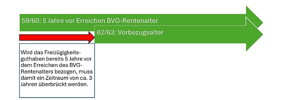 Generell haben Personen mit einem Reinvermögen von mehr als 100 000 Franken keinen Anspruch auf EL. Dies liegt an der neu eingefügten Vermögensschwelle für die EL. Da die AHV-Rente erst zwei Jahre vor dem BVG-Rentenalter vorbezogen werden kann, müsste somit ein Zeitraum von ca. drei Jahren mit den Freizügigkeitsleistungen überbrückt werden. Bei einem zu frühen Bezug der Freizügigkeitsleistungen bestünde somit die Gefahr, dass die Gelder bei Erreichen des AHV-Vorbezugsalters bereits ganz oder teilweise aufgebraucht sind. Möglicherweise muss die Person dann wieder Leistungen der Sozialhilfe beziehen.