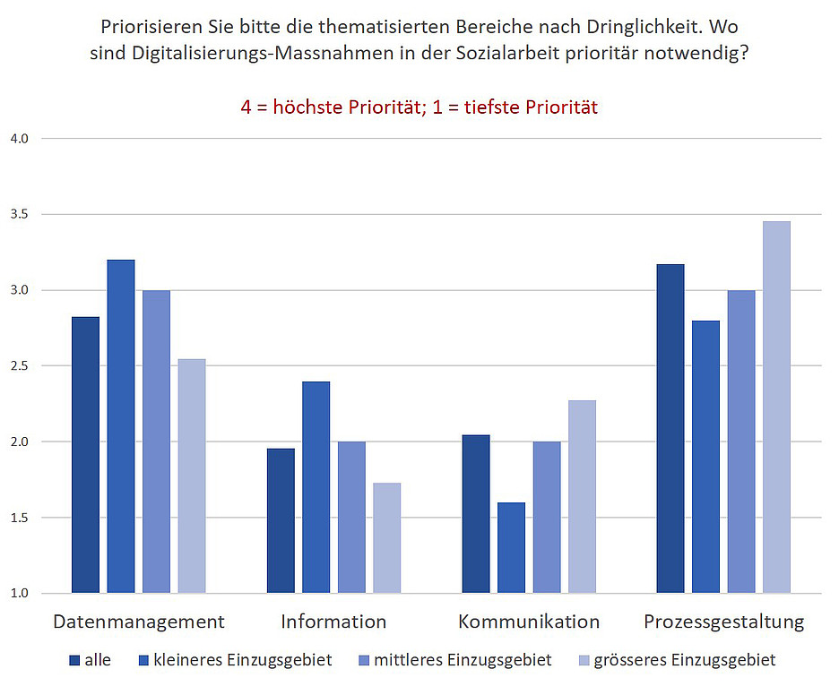 Während das Potenzial in der Kommunikation und bei den Arbeitsprozessen am grössten eingeschätzt wurde, genoss das Datenmanagement gegenüber der Kommunikation höhere Priorität. Bei den Arbeitsprozessen stimmen Potenzial und Priorität überein.