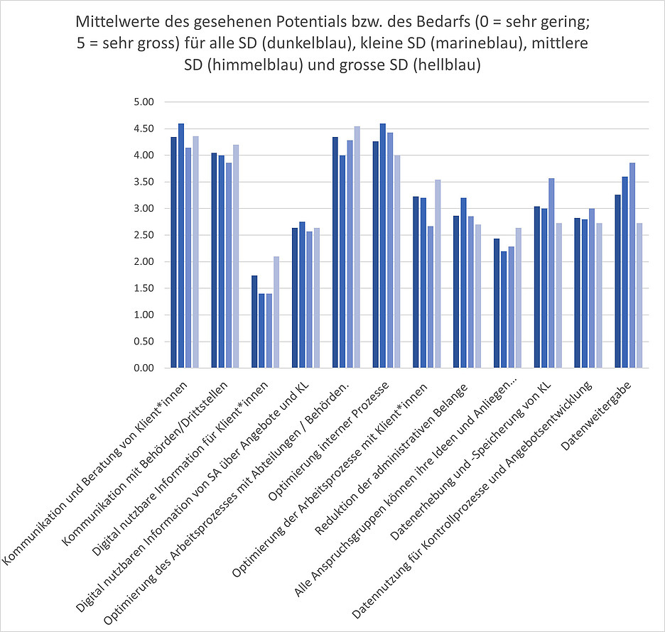In der Kommunikation/Beratung mit Klienten sowie mit anderen Abteilungen und Behörden wurde in der digitalen Transformation betreffend Effizienz/Effektivität, Datenschutz und Anpassung an den Bedarf ein sehr grosses Potenzial gesehen. Im Bereich der Information unterschieden sich die Antworten deutlich: Während sich die Hälfte der Antwortenden im Mittelfeld verortete, lagen die Antworten der anderen Hälfte weit auseinander: bei sehr tiefer bzw. bei sehr hoher Selbsteinschätzung. Bei der digitalen Informationsbeschaffung für die Mitarbeitenden hingegen, beispielsweise über Klientinnen und Klienten sowie über nutzbare Angebote wie Heime, Programme der Arbeitsintegration und anderem, waren zwei Drittel der Antwortenden der Meinung, dass diese nicht ausreichend möglich sei. Diese Einschätzungen waren unabhängig von der Grösse der Organisation.