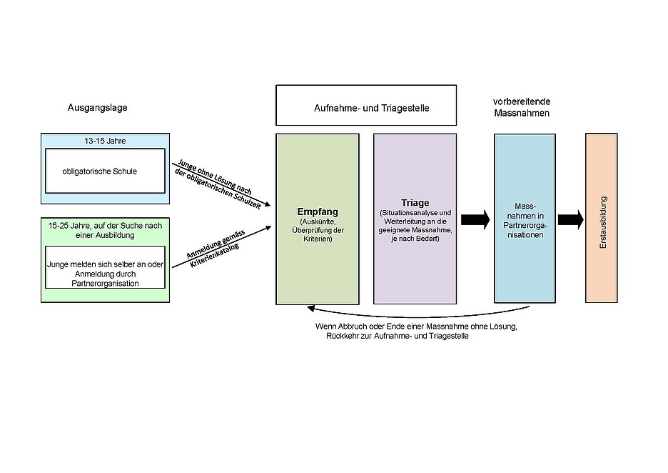 Vorgesehen ist eine zentrale Anlaufstelle für alle Jugendlichen zwischen 15 und 25 Jahren, die sich in einer Krise befinden und noch keine abgeschlossene Ausbildung haben. Die Jugendlichen können sich mittels Onlineformular bei der zentralen Anlaufstelle anmelden oder werden durch Sozialpartner in Form der oben erwähnten Mentorings gemeldet. Jede Person, die eine Massnahme des Systems ohne Lösung verlässt, soll für eine schnelle (erneute) Kontaktaufnahme seitens der Aufnahme- und Weiterleitungsstelle gemeldet werden, um so weit wie möglich zu verhindern, dass Jugendliche zu lange auf der Strecke bleiben. Diese systematische Rückführung der Jugendlichen an die Verweisungsstelle scheint einen erheblichen Mehrwert darzustellen, um zu verhindern, dass die Jugendlichen erneut abbrechen.