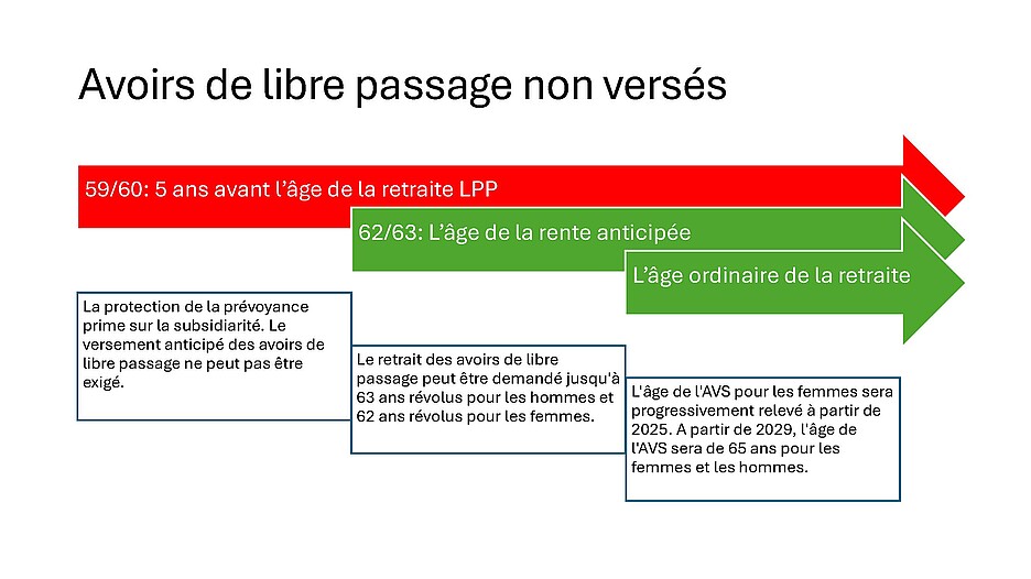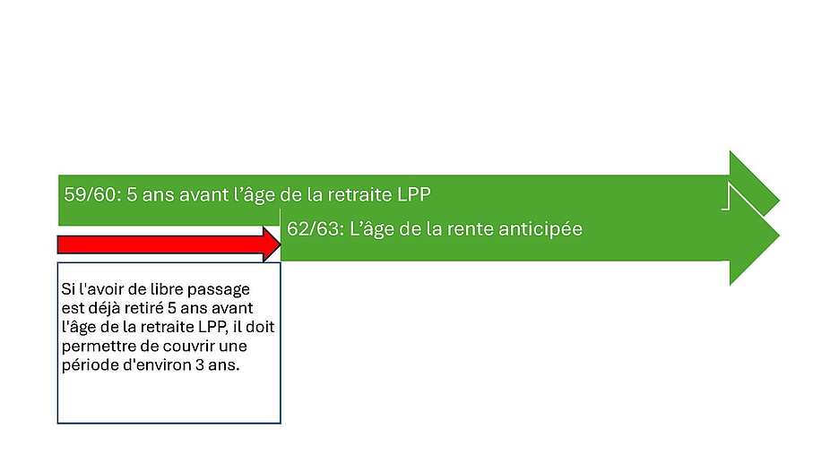 La notion d’avoir de libre passage désigne les fonds de la prévoyance liée provenant de polices et comptes de libre passage du 2e pilier (loi sur la prévoyance professionnelle, LPP) et du pilier 3a (épargne privée). Lorsqu'un salarié quitte son emploi sans reprendre directement une nouvelle activité, les fonds accumulés dans sa caisse de pension sont transférés sur un compte de libre passage. Le régime de pension prévoit que les avoirs des comptes de libre passage peuvent être retirés au plus tôt cinq ans avant et au plus tard cinq ans après l’atteinte de l’âge AVS. Actuellement, les femmes peuvent donc percevoir leurs prestations de libre passage à partir de 59 ans et les hommes dès 60 ans. Cinq ans avant le versement de la rente AVS, la personne concernée possède donc un capital dont elle pourrait disposer.