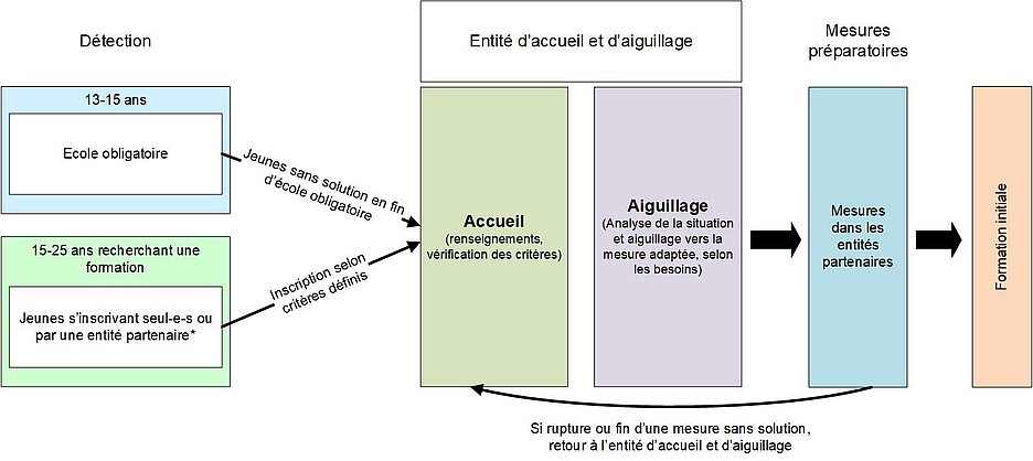 Le dispositif prévoit la création d’une entité d’accueil et d’aiguillage, qui constituera une porte d’entrée unique vers laquelle seront dirigé-e-s toutes et tous les jeunes de 15 à 25 ans en rupture et sans formation certifiante préalable.